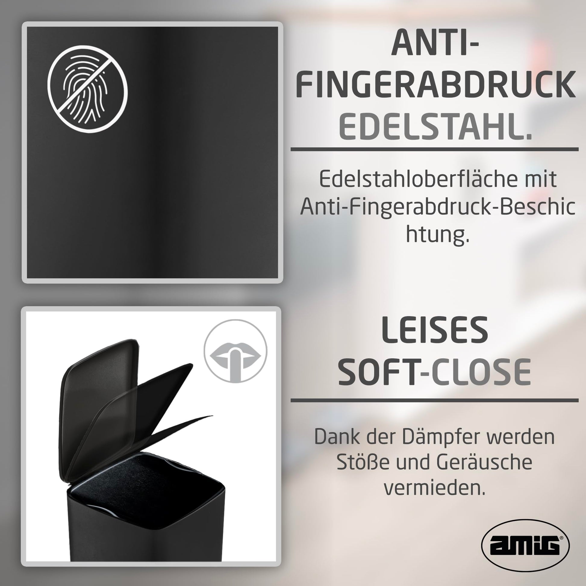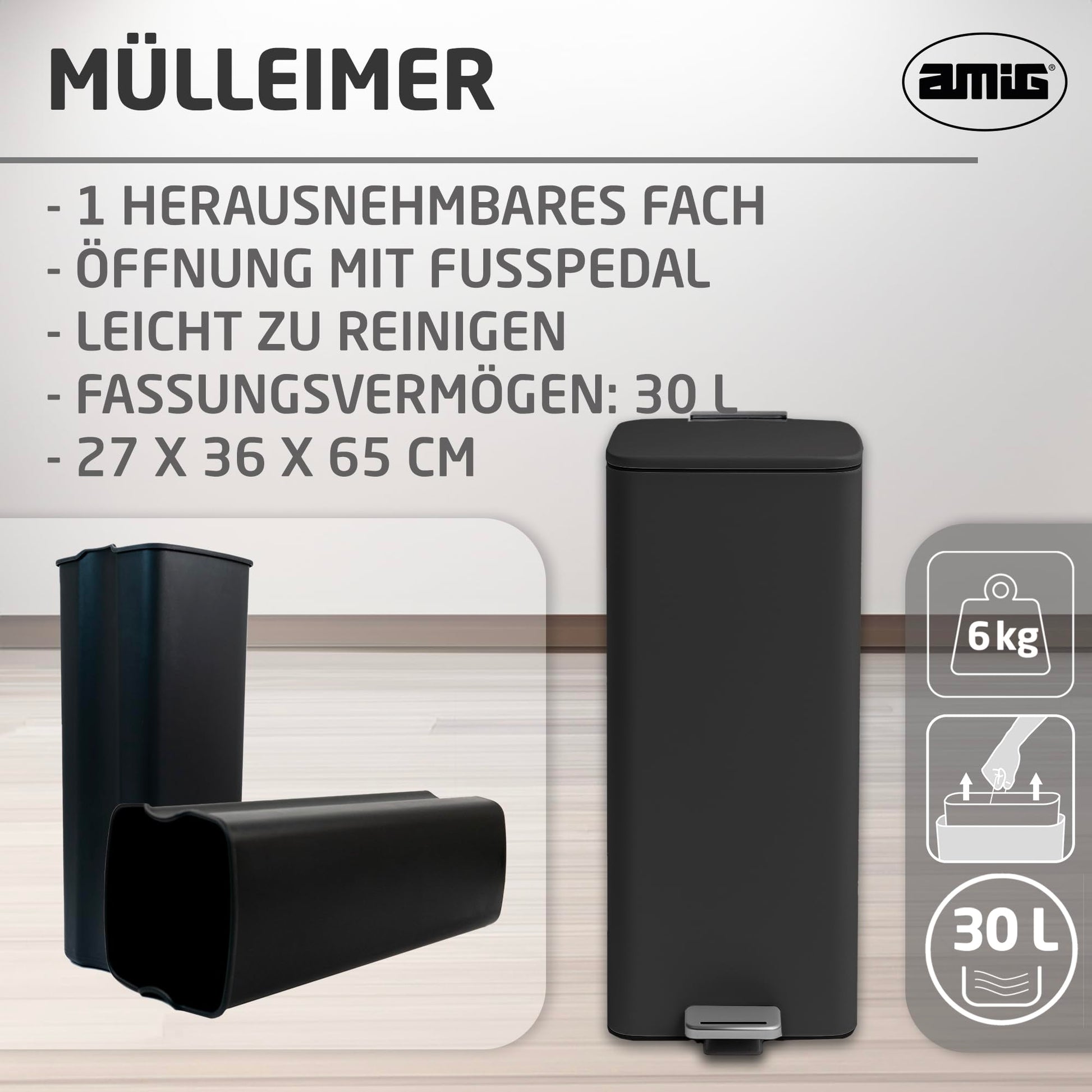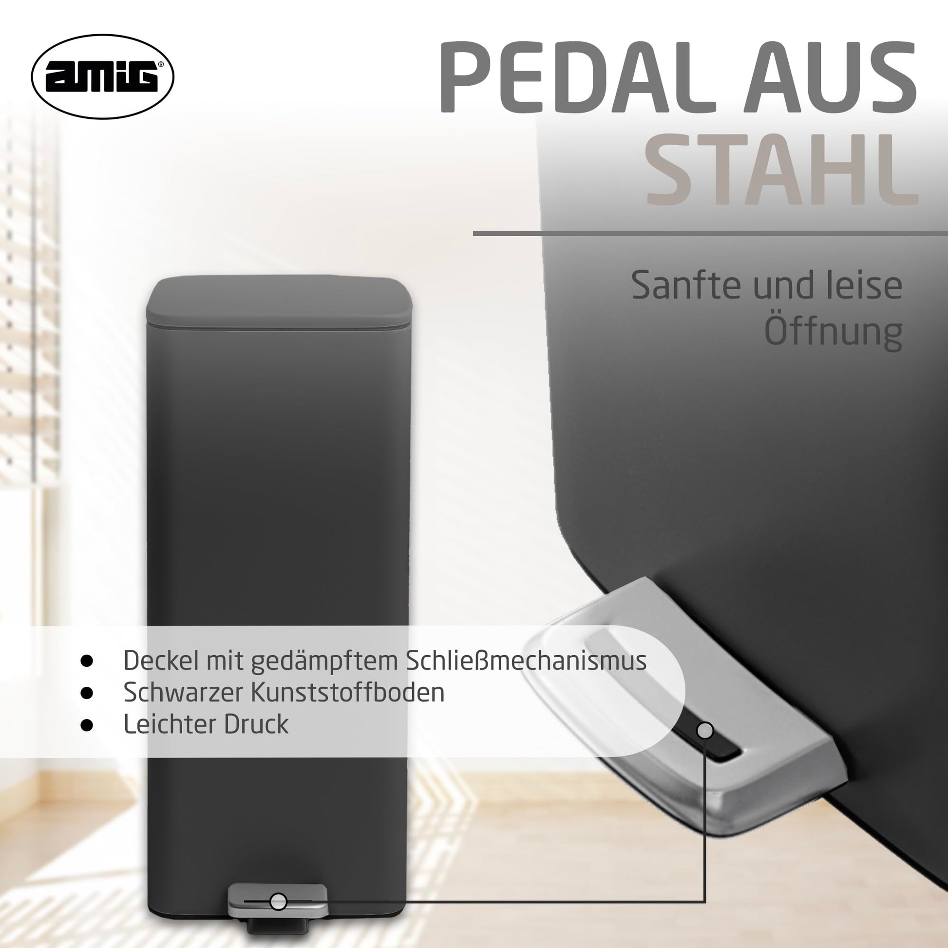 Amig - Cubo de Basura con Pedal 30 Litros Mod. Artvin - Color Negro - Apertura higiénica sin manos - 27 x 36 x 65 cm - Acero inoxidable lacado - Papelera para cocina con Tapa Hermética