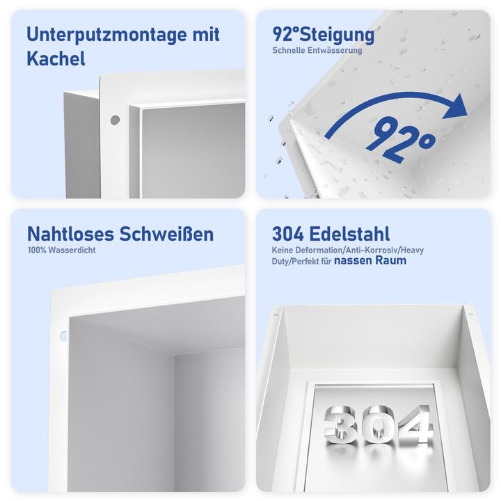 Bernkot Nicho de ducha de acero inoxidable blanco 60 cm × 30 cm × 10 cm No requiere azulejos ducha nicho para almacenamiento de baño nicho de ducha empotrada sin bordes, montaje al ras
