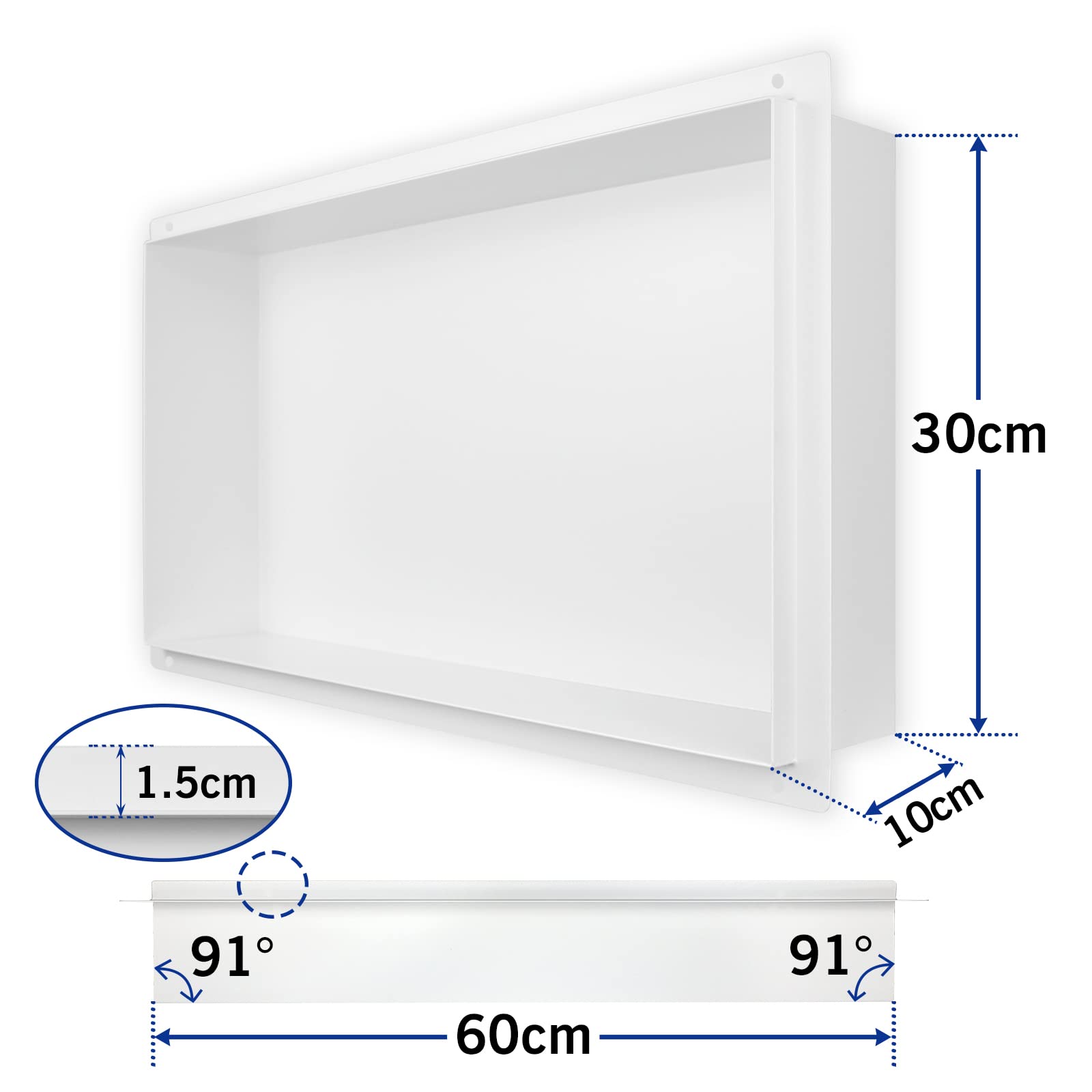 - Tamaño: nicho de pared de acero inoxidable blanco sin bordes. Las dimensiones interiores son de 60 cm x 30 cm x 10 cm.