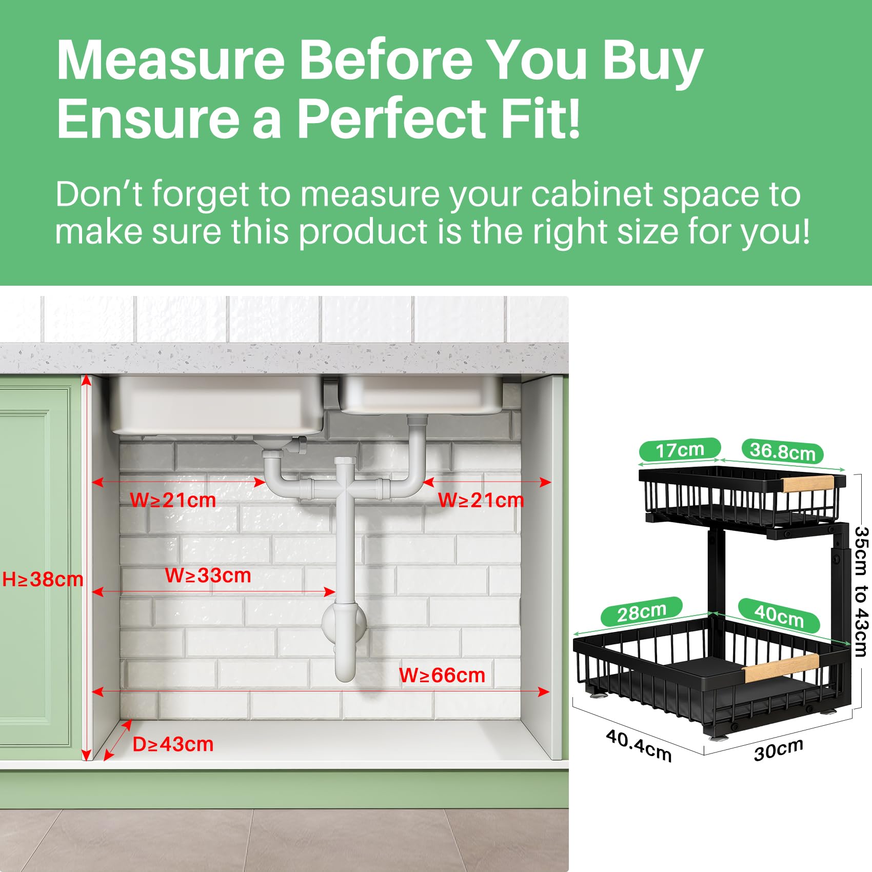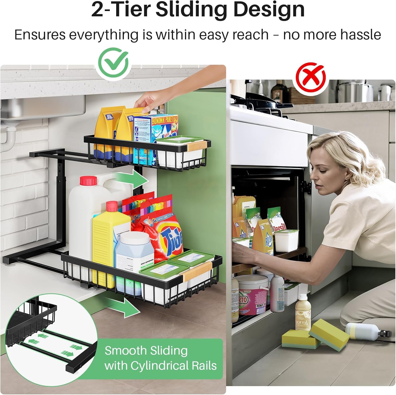 - 【Cestas deslizantes de 2 niveles】Los organizadores y almacenamiento debajo del fregadero están diseñados con un diseño único en el que tanto las cestas superior como inferior se pueden extraer, lo que te permite acceder a los artículos que se almacenan debajo del fregadero
