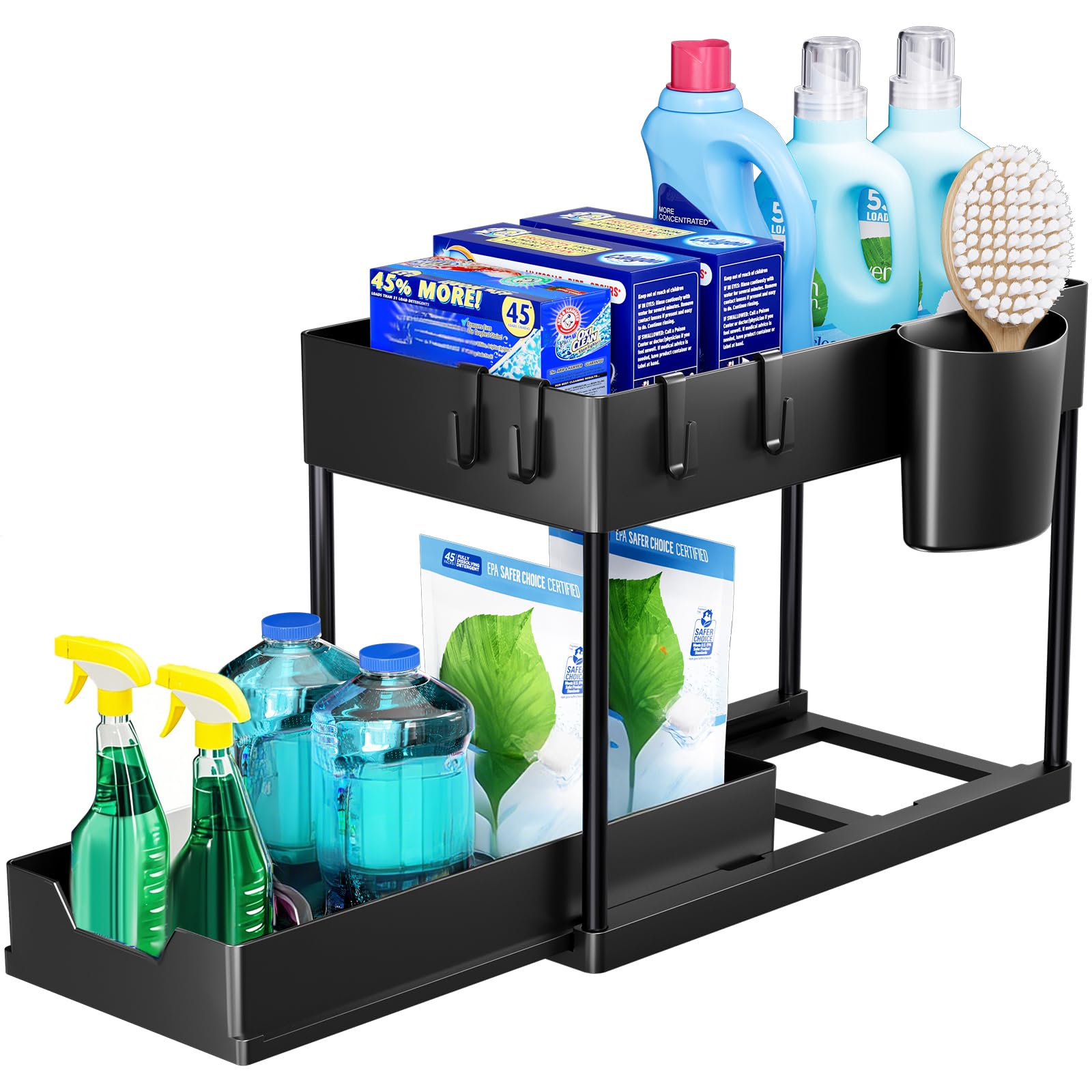 Puricon Estantería Bajo Fregadero con Cajón Deslizante y Ganchos, Organizador para Cocina y Lavabo, Negro
